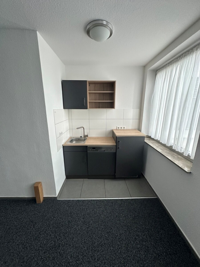 Die Büroräume sind hell gestrichen und mit einem mordenen Büroteppichboden in grau ausgelegt. Der Bereich mit der eingebauten Teeküche ist gefliest.